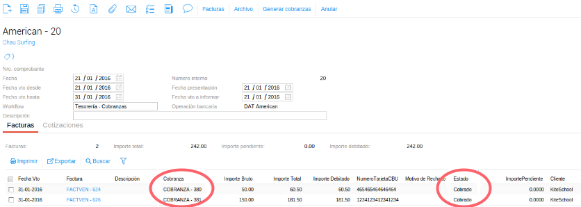El tipo de documento de cobranza a generar se toma desde la configuración del tipo de documento de “Cobros por Débito Automático” sobre el que se está trabajando. Una vez generada la cobranza, el estado de la factura en la grilla pasa a “Cobrado” y se informa el nombre y número de la cobranza generada.