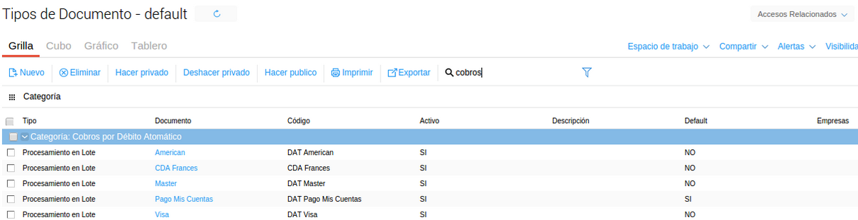 Cuando se da de alta un nuevo proceso de cobro por débito automático, debés elegir el documento tipo indicado para la entidad de tarjeta de crédito o banco correspondiente.