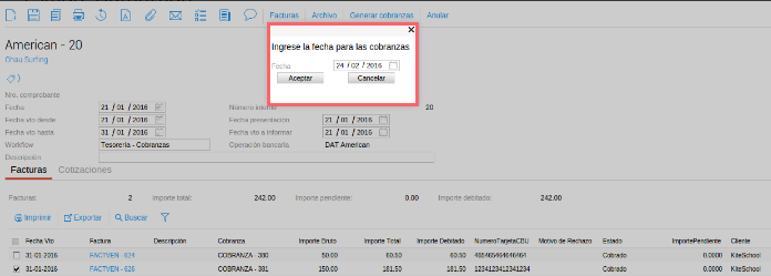 Al momento de generar las cobranzas se muestra una ventana emergente para indicar la fecha en que se generan las mismas.