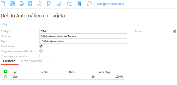 Se debe crear al menos una condición de pago cuyo tipo sea “Débito Automático en tarjeta”. Esta condición de pago será la que se utilizará en las facturas de venta que se cobrarán por este proceso.