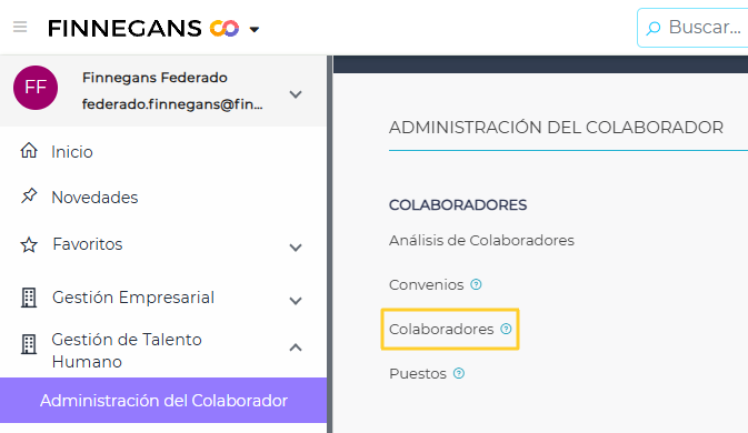 Ingresar al menú > Gestión de Talento Humano > Administración de Colaborador > Colaboradores.