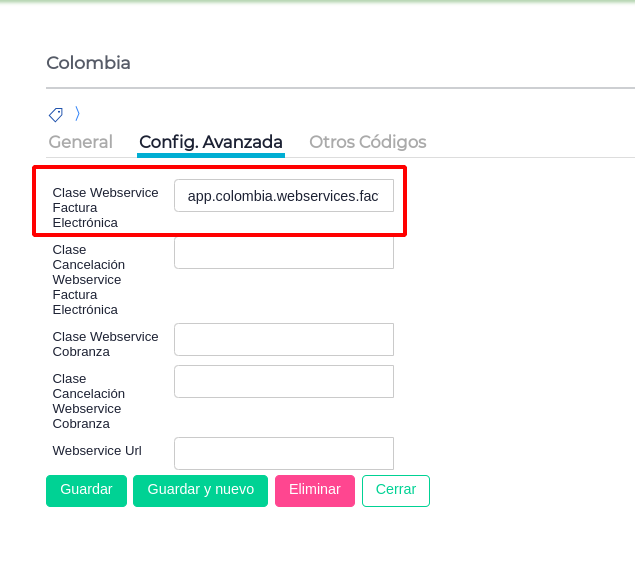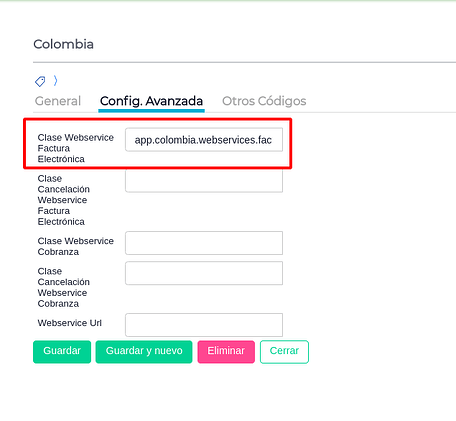Debemos buscar Colombia en el maestro Países. Luego deberemos seleccionar la solapa Configuracion Avanzada y en el campo “ Clase webservice factura electrónica” completar con la siguiente información: app.colombia.webservices.facturaelectronica.service.FeelService