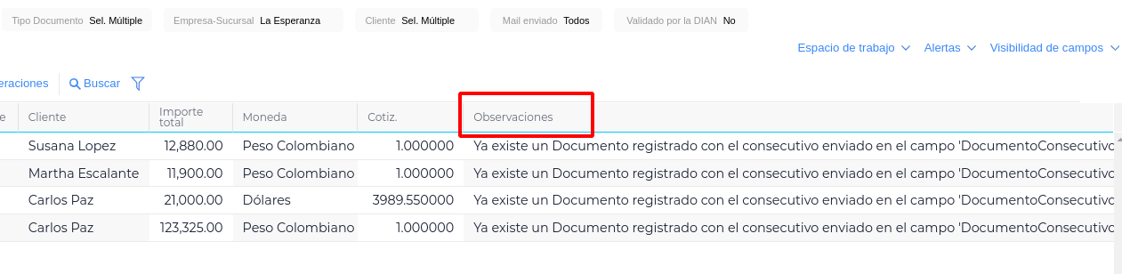 Por último, si en el proceso de validación se llegasen a presentar errores, los podremos observar en la columna Observaciones. Luego de hacer las correcciones necesarias, podremos intentar nuevamente el timbrado masivo.