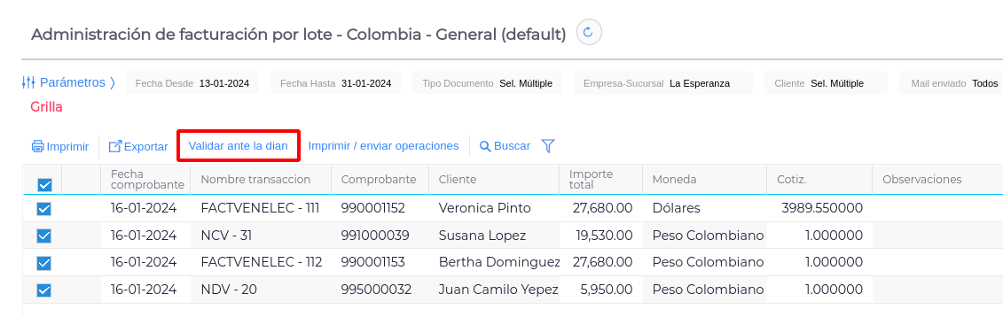 IMPORTANTE: En el campo Validado por la DIAN, debemos seleccionar “No”, de esta forma observaremos aquellos documentos que aún no han sido validados.
