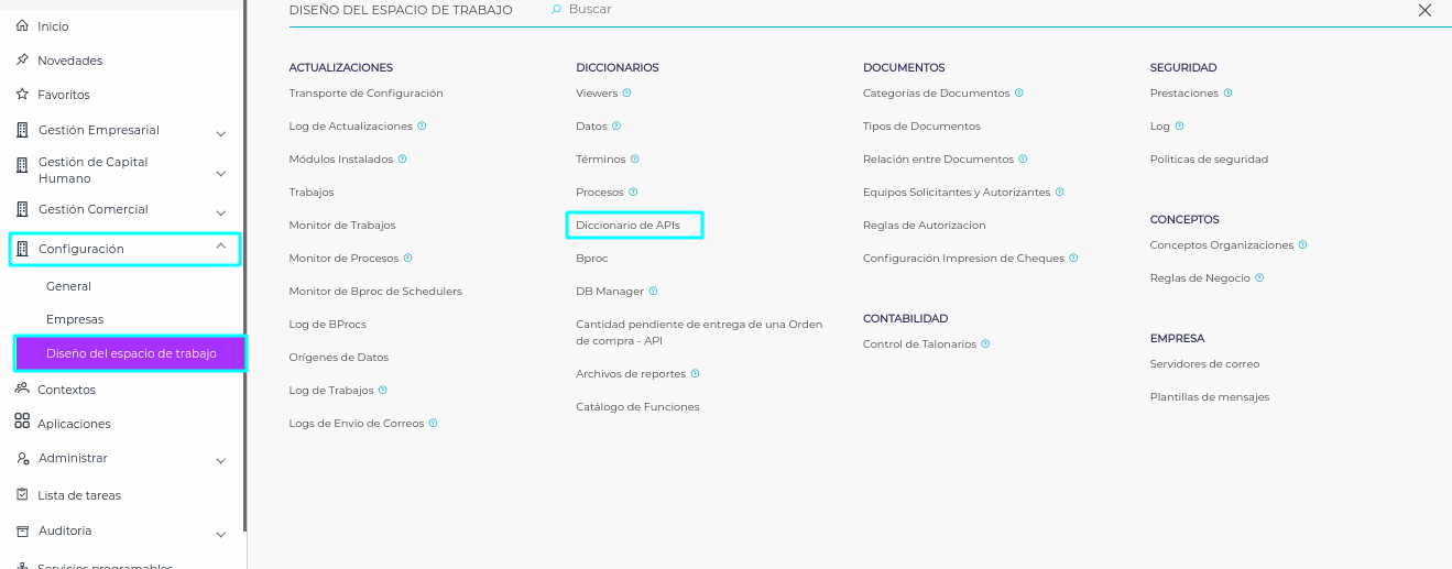 Una vez que ingresamos a Finnegans, se debe acceder a Configuración > Diseño del Espacio de Trabajo > Diccionario de APIs.