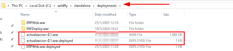 Al copiar el nuevo archivo de actualización, se generará automáticamente un nuevo archivo con el mismo nombre y con la extensión “.deployed”, Si en lugar de “.deployed” aparece “.undeployed”, se debe eliminar este último archivo para que el sistema intente nuevamente desplegar el war.