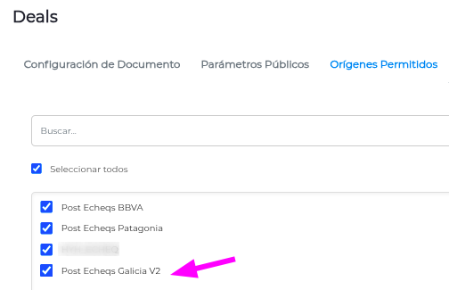 Entrar a la solapa “Orígenes Pemitidos”. Si no estuviera visible, activar el check “Activar webhook” desde la solapa “Configuración de Documento”.