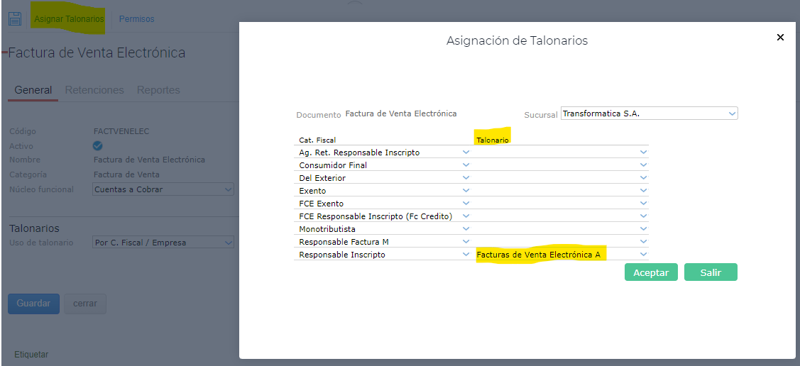 Buscar el documento, ingresar y hacer click en “Asignar Talonarios”. Verificar que para todas las categorías fiscales que se utilizan tengan asociado el talonario correspondiente.
