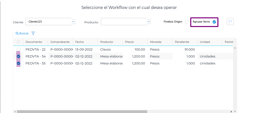 2- Realizar un nuevo Remito, seleccionar los Pedidos de Venta en el workflow y activar la opción Agrupar ítems.