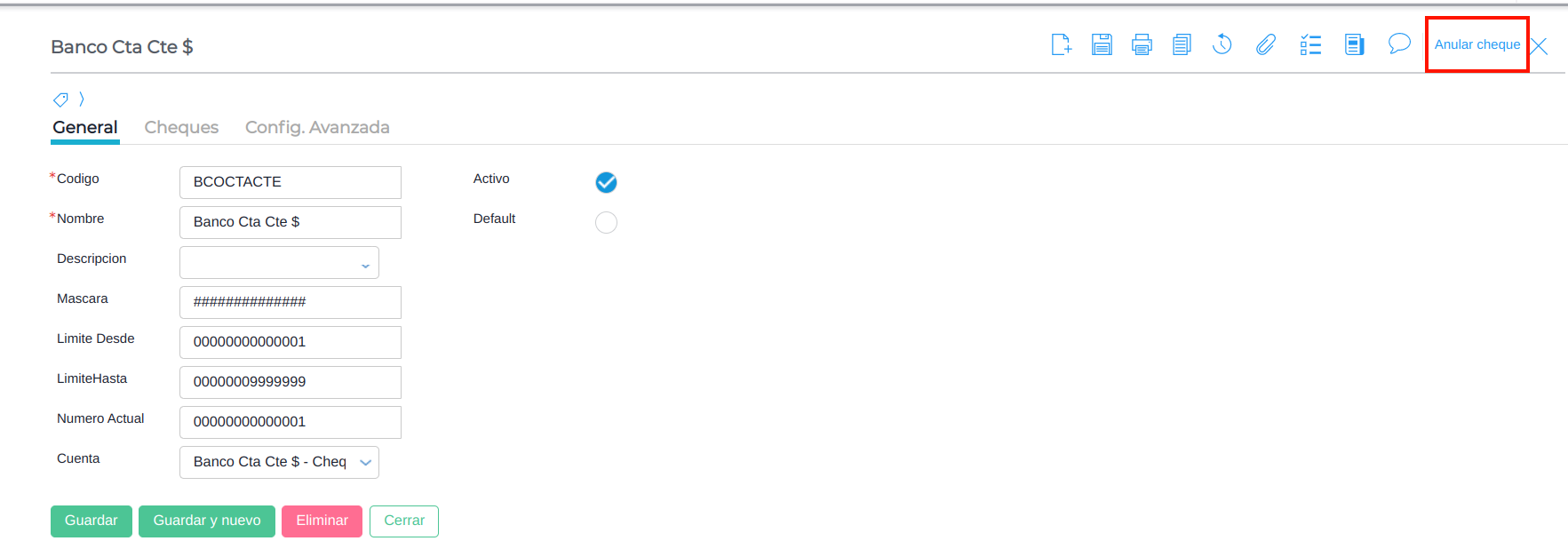 Los cheques se pueden anular desde la chequera a la cual pertenecen.