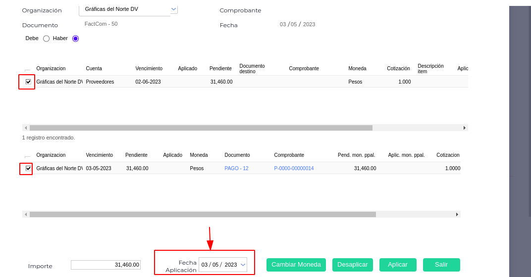 - Tildar los documentos que se desean aplicar entre sí → hacer clic en “aplicar”