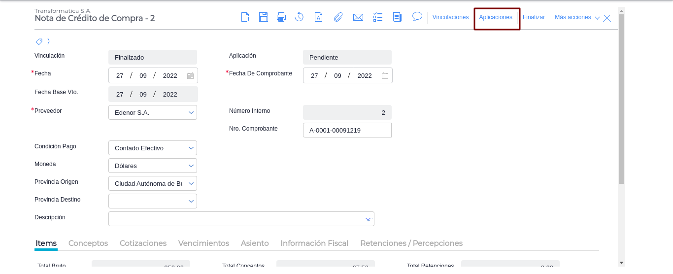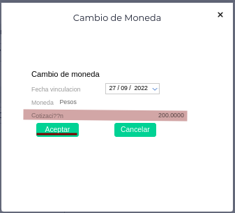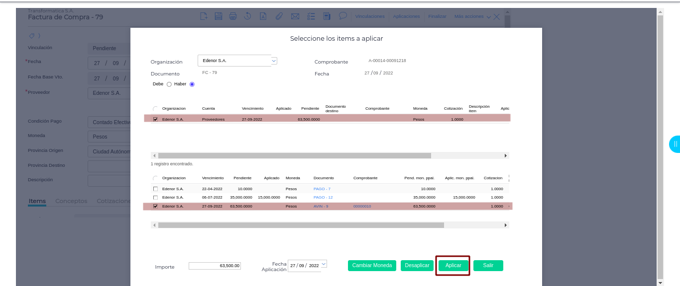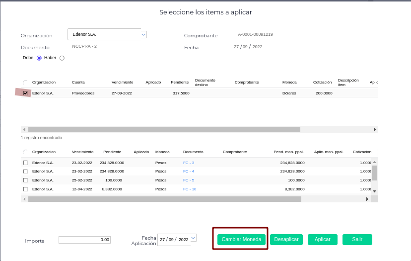 Para aplicar documentos que tienen diferente moneda, hay que cambiar la moneda de uno de los documentos.