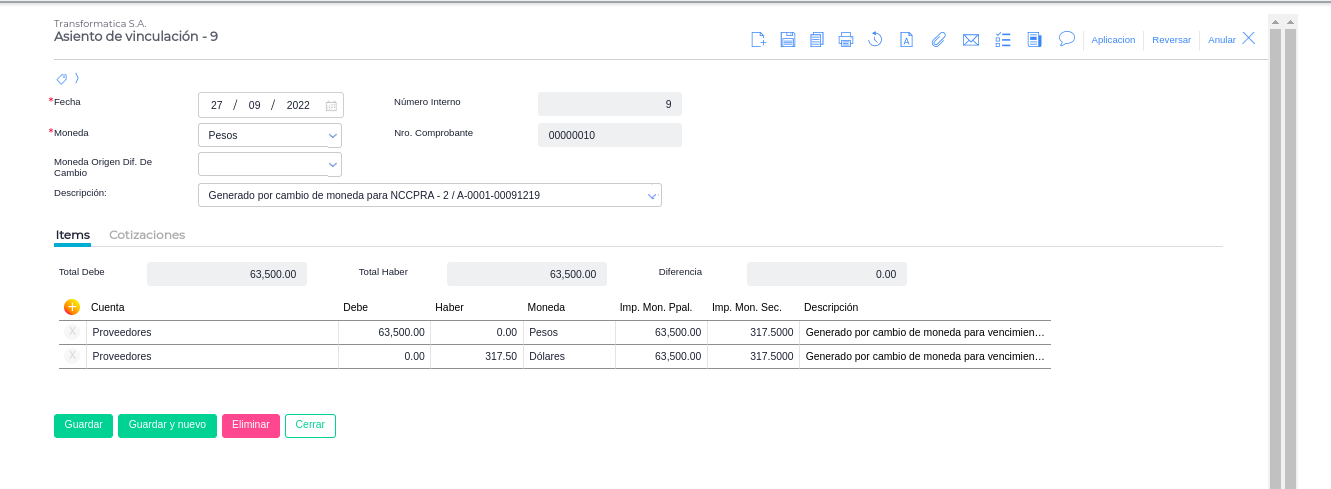 6- Por último, aplicar el documento al Asiento de vinculación que generó el sistema por el cambio de moneda.