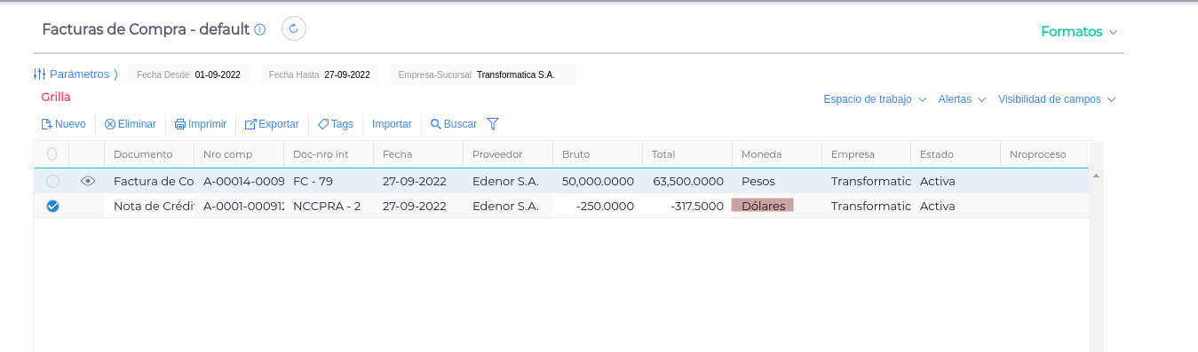 1- Seleccionar el documento al cual se le va a cambiar la moneda.