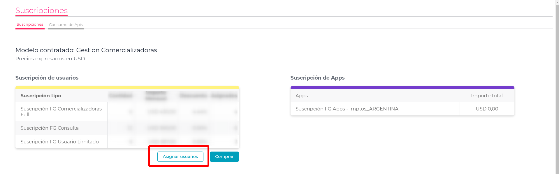 Al ingresar desde el botón “Asignar usuarios” que está en la home de Suscripciones vemos la lista de mis usuarios internos a los cuales les puedo asignar las categorías “Full, limitado y Consulta” seleccionando el usuario y presionando el botón “Cambiar categoría”.