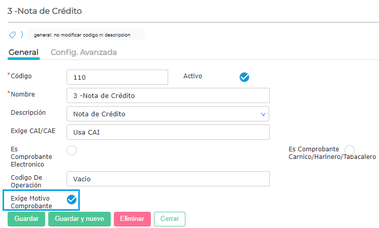 1 - Configurar el comprobante tipo impositivo asociado al talonario para que “exija motivo”