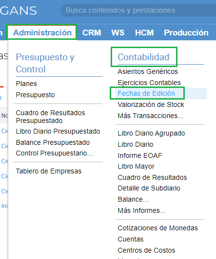 - Ir por Administración>Contabilidad>Fechas de Edición.