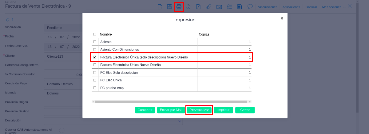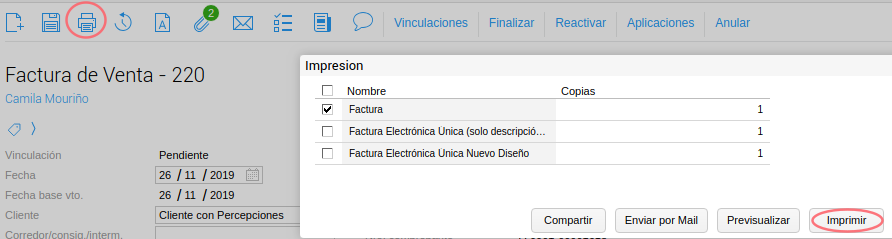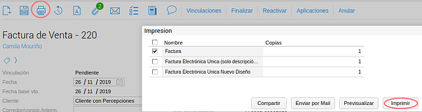 Elegimos el reporte de impresión Factura. En este caso se encuentra configurado para mostrar el nombre de la organización junto con el nombre del documento y su número interno.