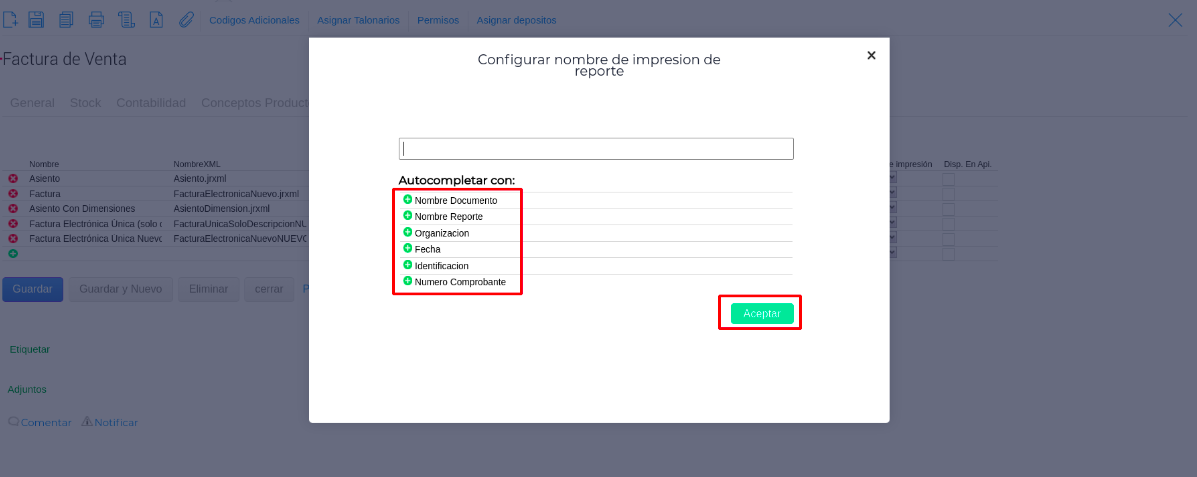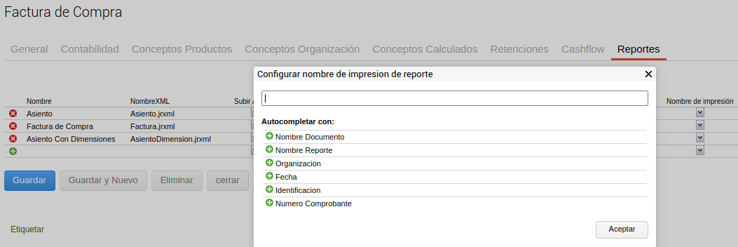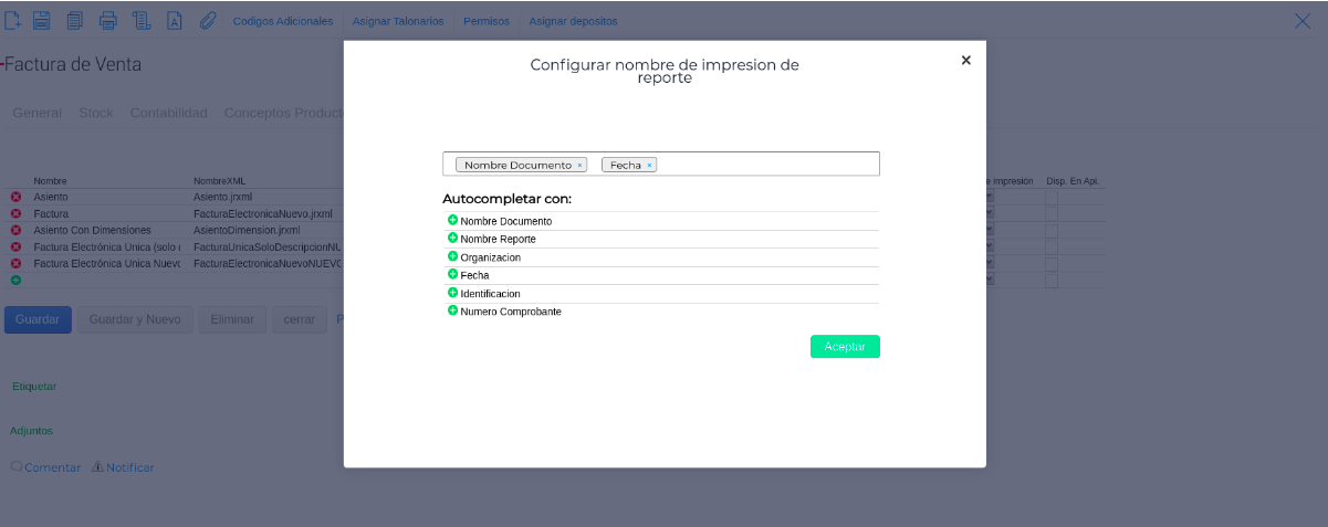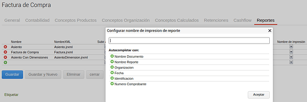 - Se abre la siguiente ventana para configurar el nombre de impresión del reporte que seleccionamos. En este ejemplo, utilizaremos el reporte Asiento.