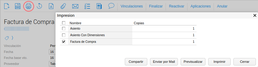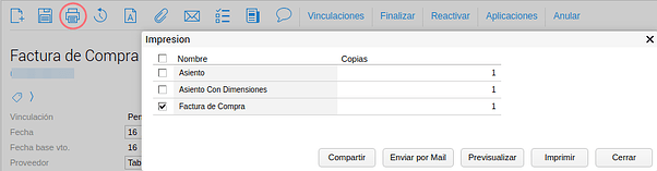 Utilizamos en este ejemplo el reporte de impresión Factura de Compra, el cual se encuentra configurado para que imprima el nombre del documento, junto con el número de comprobante y el proveedor al que corresponde el mismo.