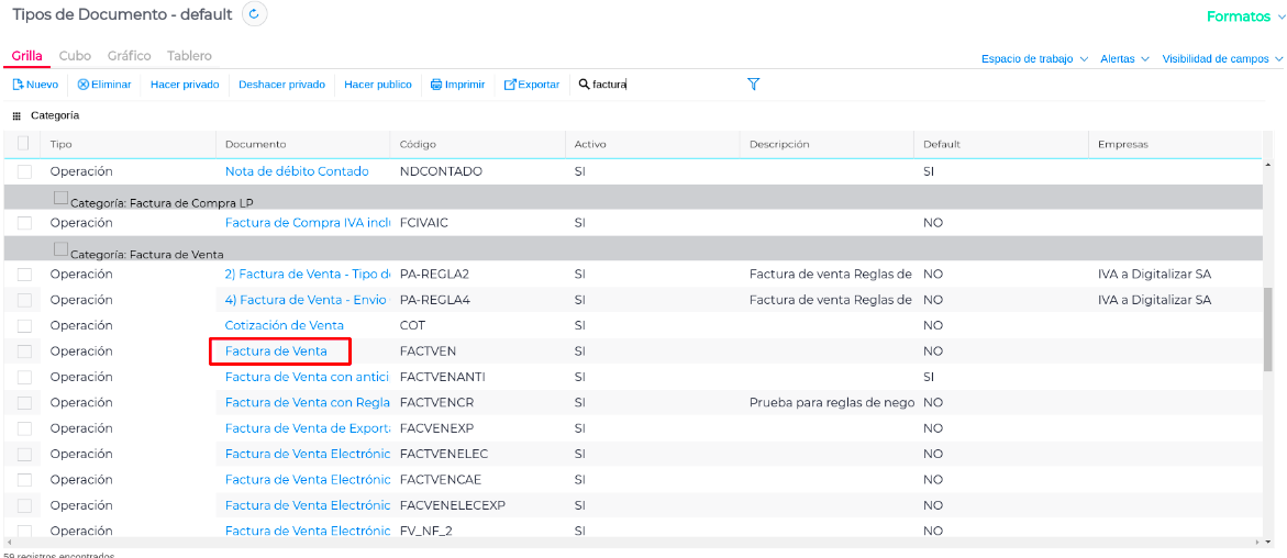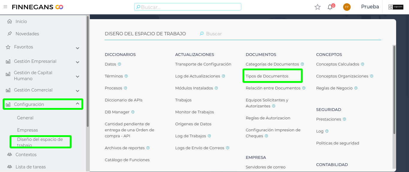 - Acceder desde el Menú → Configuración → Diseño del espacio de trabajo → Documentos → Tipos de Documento