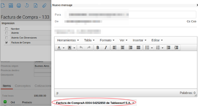 Nombre documento: el PDF se genera con el nombre del documento, en este caso factura de compra.