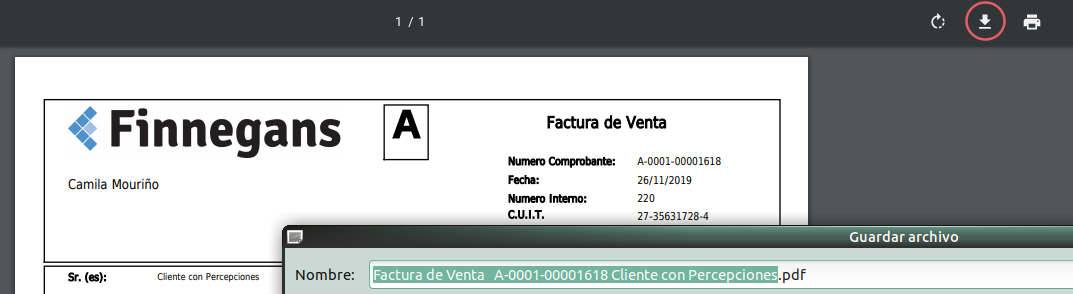 Como forma de impresión elegimos la previsualización, la cual nos muestra el comprobante a guardar. Seleccionamos el botón guardar archivo y se puede observar que el nombre del archivo corresponde a lo configurado en Tipos de Documento.