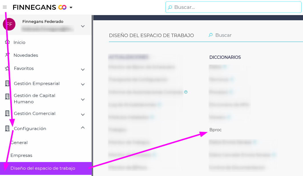 Para activar el Bproc ir a Menú → Configuración → Diseño del espacio de trabajo → Bproc