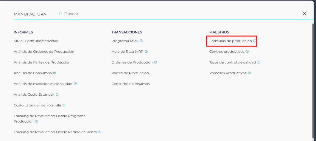Para acceder al maestro se debe ingresar dentro del menú → gestión empresarial → Manufactura y acceder desde la columna Maestros a fórmulas de producción.