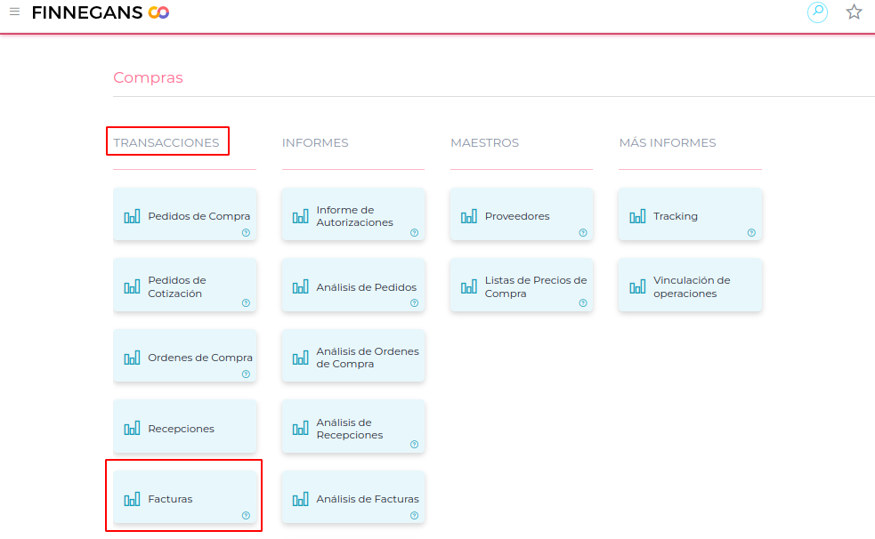 1- Ir a Menú > Gestión Empresarial > Compras > Facturas