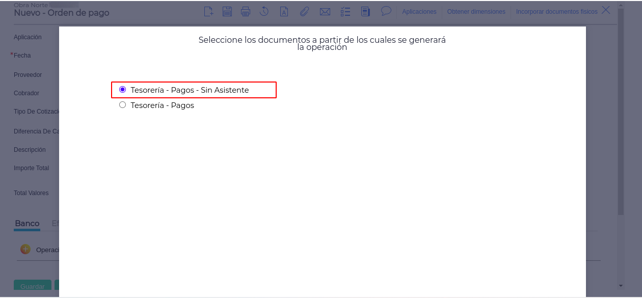Respuesta: Para registrar una orden de pago con las características nombradas anteriormente, se debe seleccionar el tipo de documento a partir del cual se generará la operación (también denominado “workflow”) “Tesorería- Pagos- Sin Asistente” , desde el módulo de Tesorería.