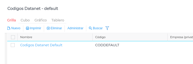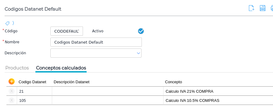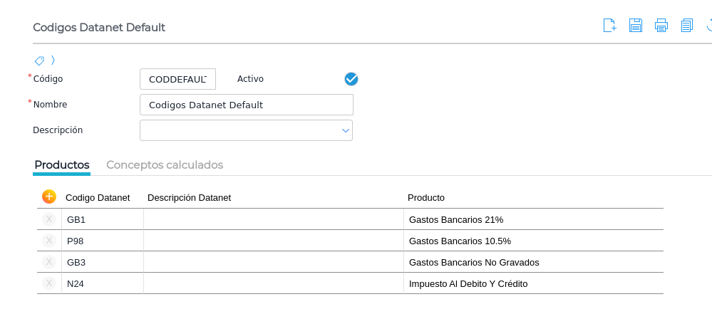Códigos Datanet (para vincular gastos bancarios a productos o conceptos calculados de impuestos).