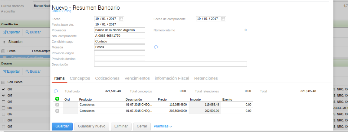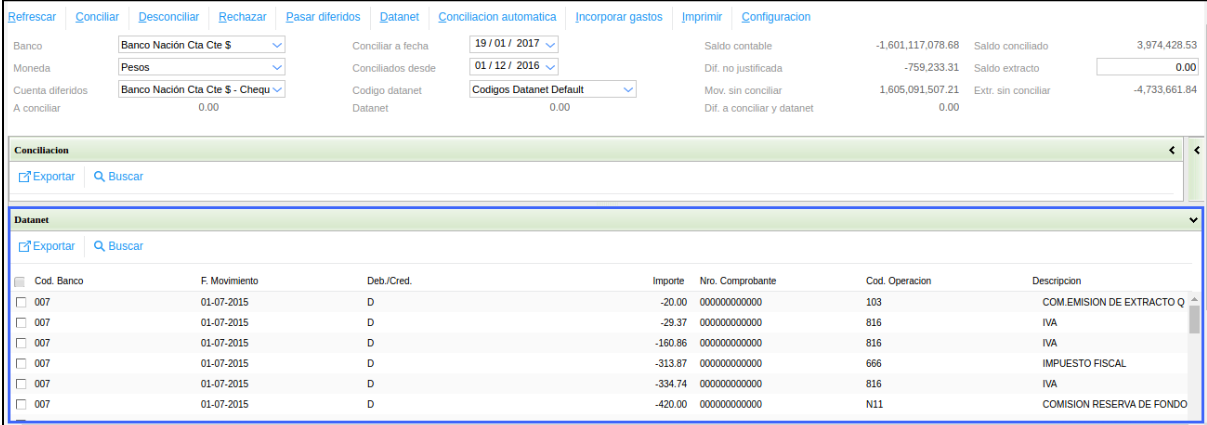 Los movimientos importados se visualizarán en la solapa Datanet de la parte inferior de la pantalla de Conciliación Bancaria.