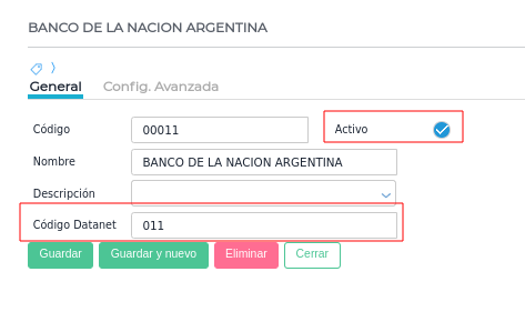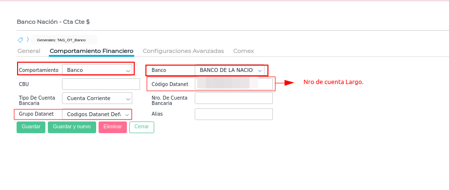 | NROCUENTALARGO | Sí | Código Datanet definido en el plan de cuentas, correspondiente a la cuenta bancaria. |