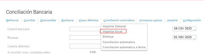 - Hacer clic en el botón Conciliación automática y seleccionar Importar Excel