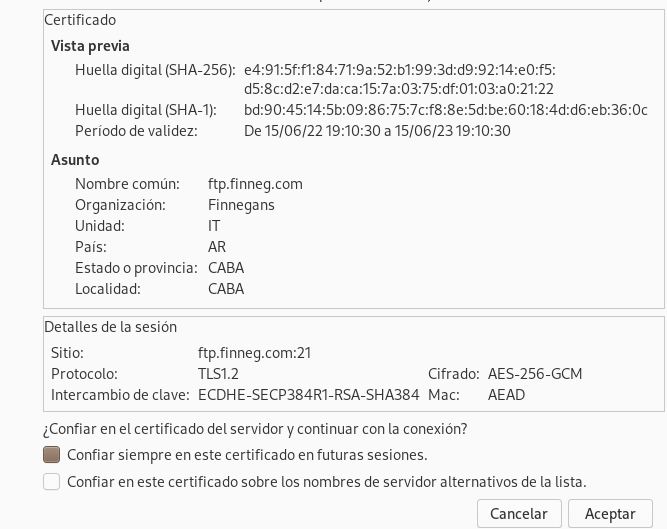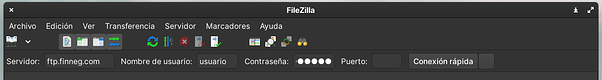 - Hay que colocar el nombre del servidor "ftp.finneg.com”, el usuario, la contraseña provista y utilizar el puerto por defecto.