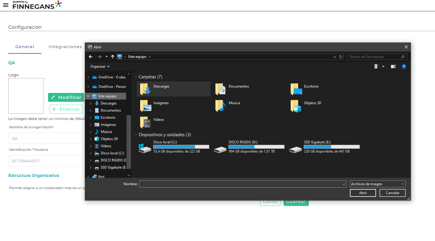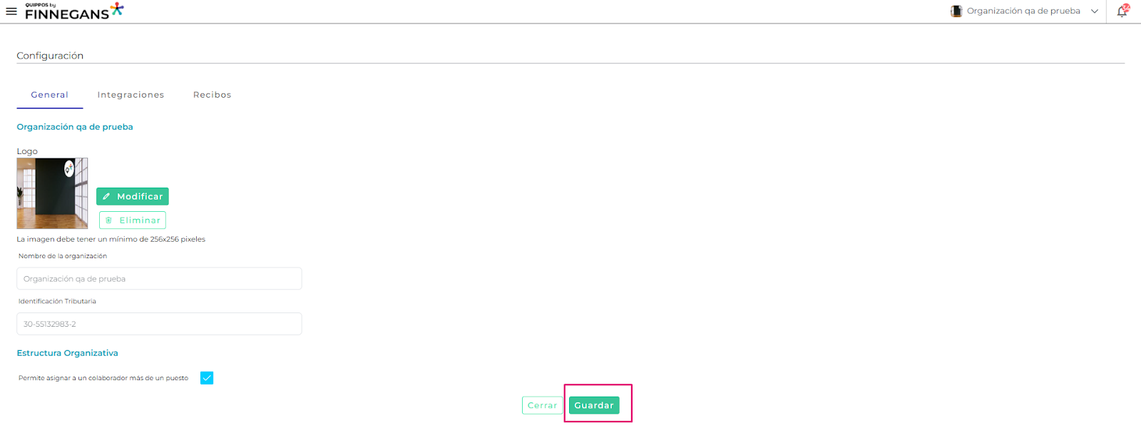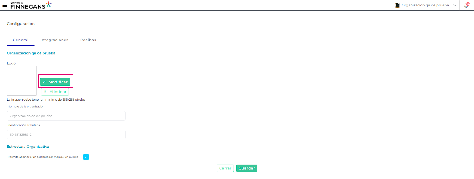 - Una vez dentro de configuración, deberá presionar el botón “Modificar” para seleccionar un logo desde el ordenador para su organización.