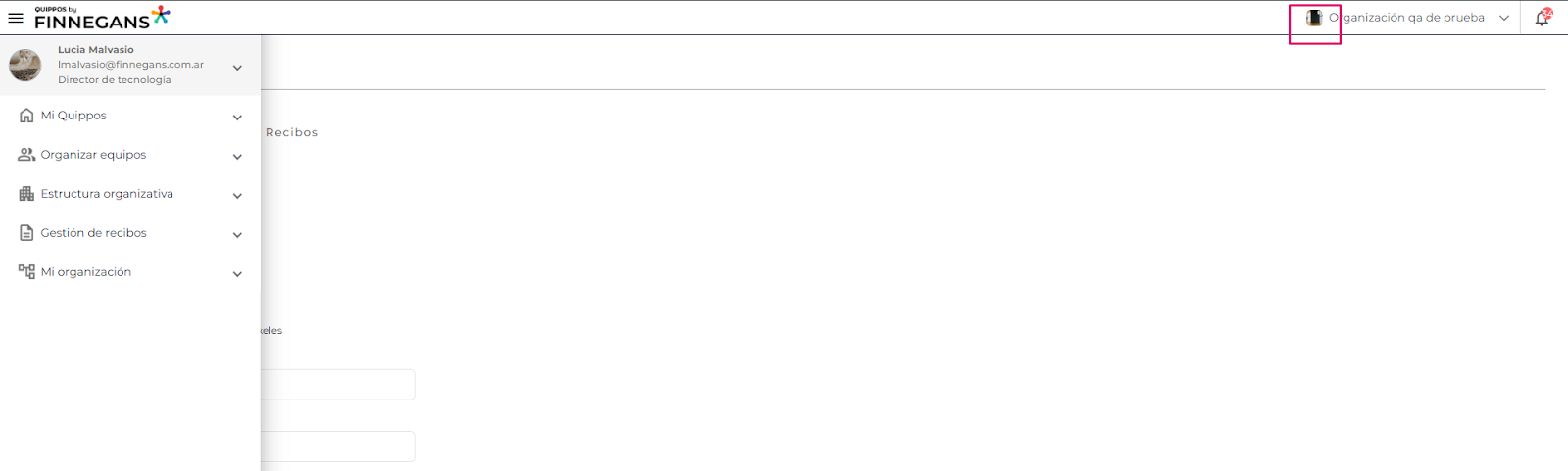 - Si se guardó correctamente deberá visualizarse en la parte superior derecha de la pantalla junto con el nombre de la organización.
