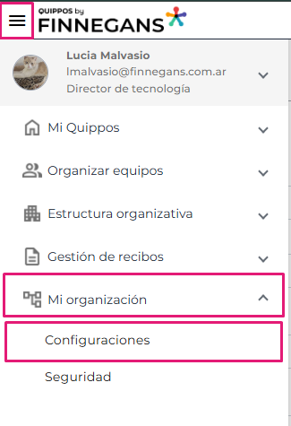 Desde El Menú hamburguesa → Mi organizacion → Configuraciones