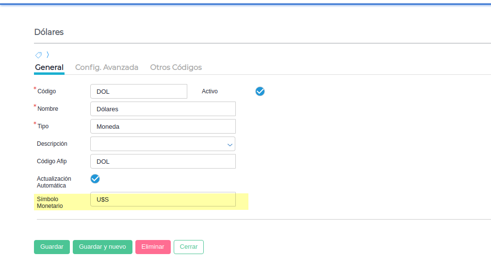 Para ello se debe completar el campo símbolo monetario con el que corresponda.