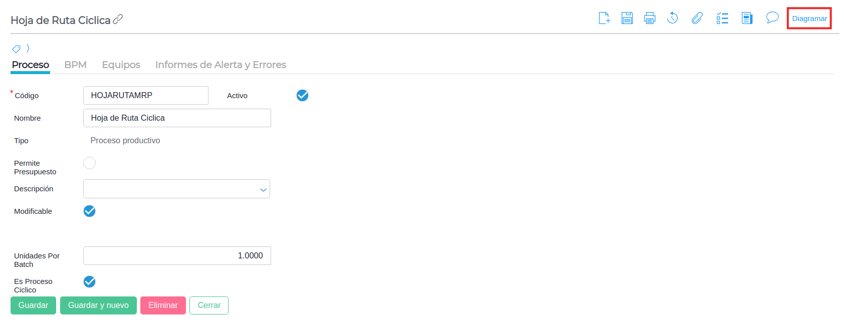 Menú → Gestión empresarial → Manufacturas → Hoja de Ruta MRP