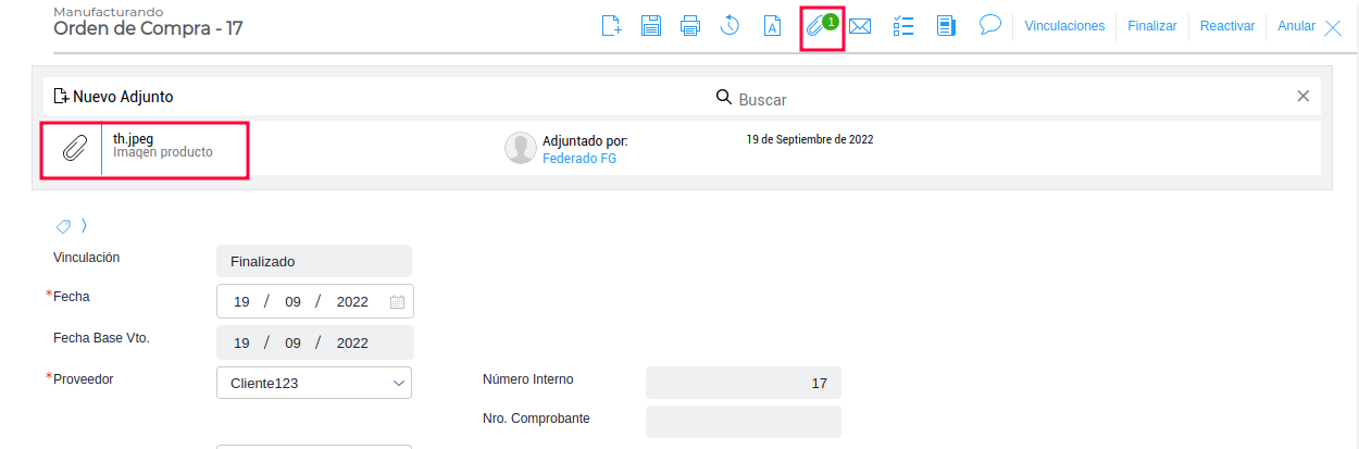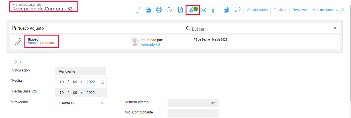 Por lo tanto al realizar la Recepción de compra utilizando el asistente, seleccionando la Orden de compra, que se muestra anteriormente, el archivo adjunto también pasa a la transacción de destino.