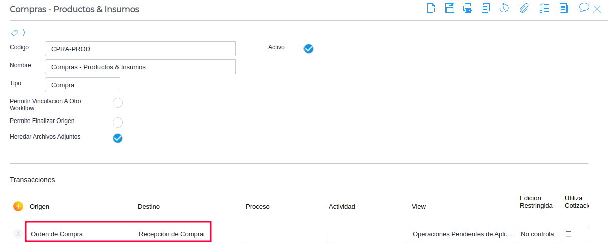 Según la configuración del workflow, la relación establecida es la siguiente, siendo el documento de origen la Orden de Compra y el documento de destino la Recepción de Compra.