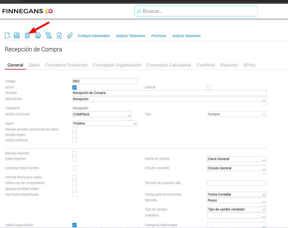 1° Se debe crear el documento Recepción de compra (o modificar el actual si así lo quieren), y tildar la opción “Permite corredor” y Guardar los cambios.