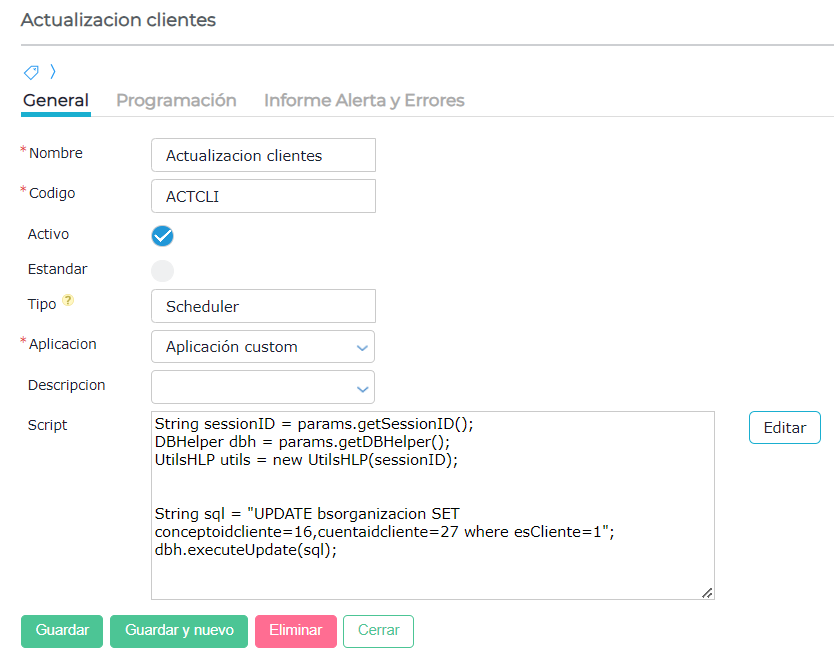 Veamos un ejemplo con un Bproc de tipo Scheduler que actualiza la Cuenta Contable y el Concepto “Clientes” para todos los clientes que no lo tengan configurado:
