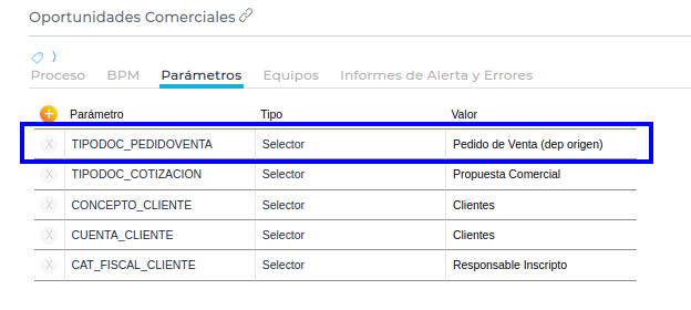 2- Ir a Menú → Configuración → Diseño de espacio de trabajo → Procesos y seleccionar “Oportunidad Comerciales”, en la solapa Parametros, configurar el parámetro TIPODOC_PEDIDOVENTA seleccionando el Pedido de venta configurado en el punto 1.