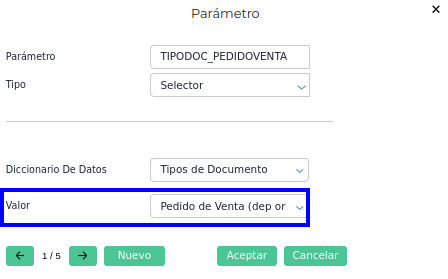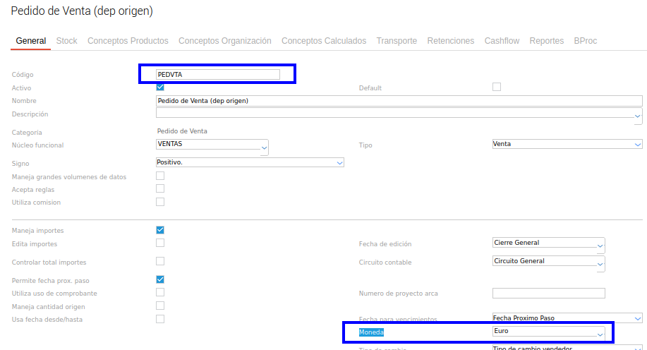 1- Ir a Menú → Configuración → Diseño de espacio de trabajo → Tipos de documento. Seleccionar un documento de la categoría “Pedido de venta” y seleccionar la moneda que se desea.