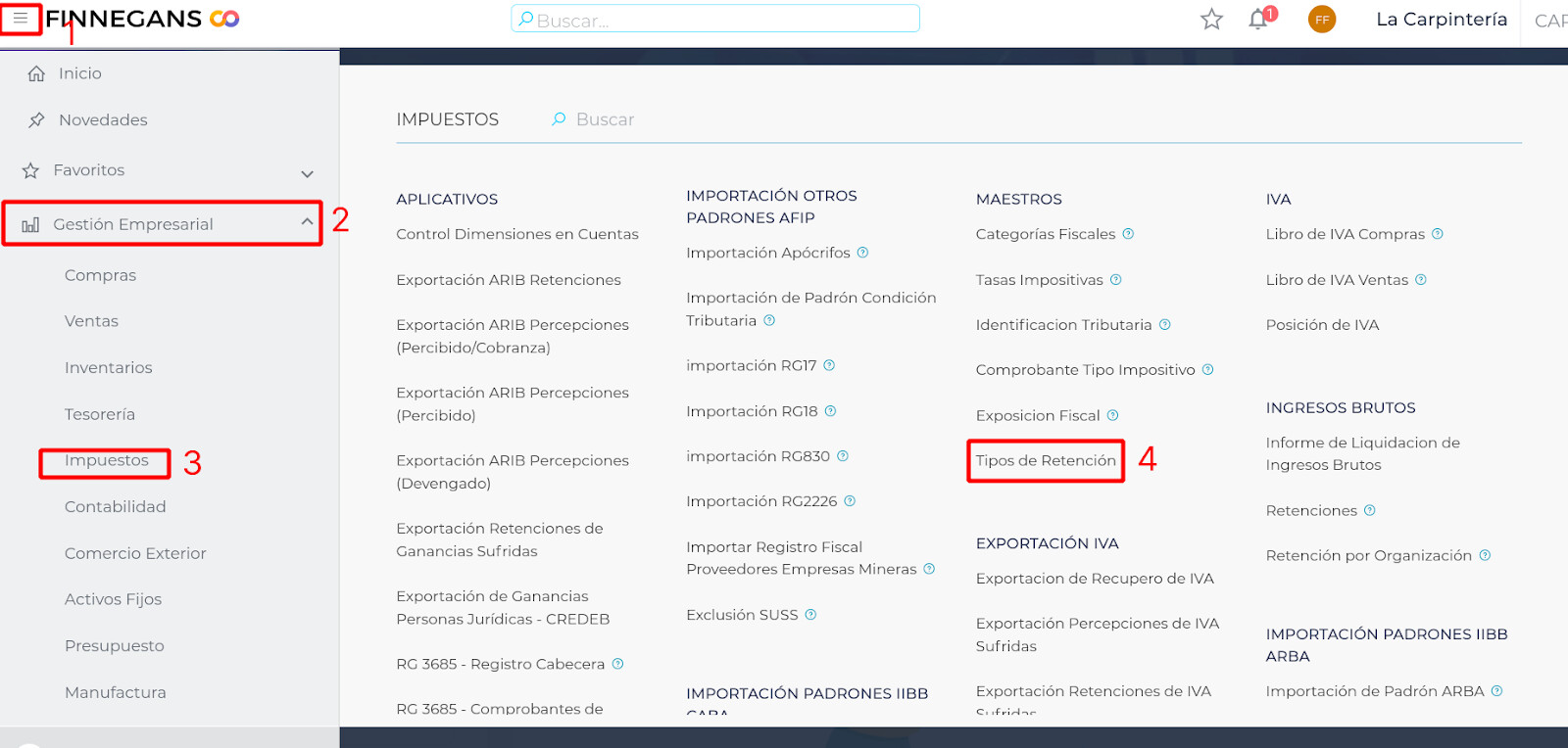 - Desde el Menú > Gestión Empresarial > Impuestos > Tipos de Retención.