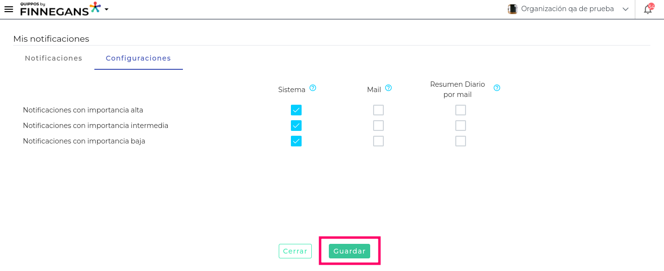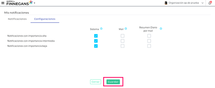 - Se podrá seleccionar los canales de notificación en base a la importancia. Se debe dejar configurado, al menos, un canal por importancia.
