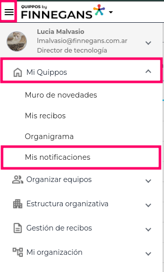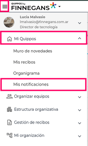 El Menú hamburguesa → Mi quippos → Mis notificaciones